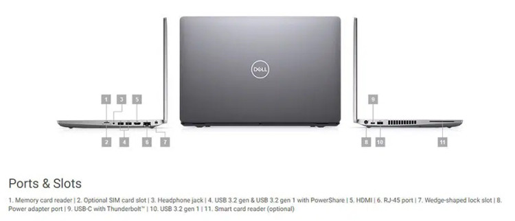 در سمت چپ دستگاه یک پورت 3.2 USB Type-C نسل 2 با پشتیبانی از DisplayPort 1.4 port/Power Delivery/Thunderbolt، یک پورت USB 3.1 نسل 1 و یک کارت خوان هوشمند ( اختیاری ) وجود دارد.